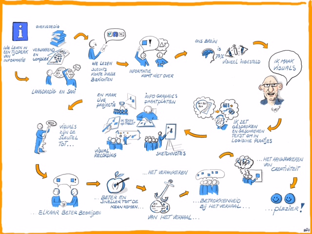 Ik werk nauw samen met je om de belangrijkste thema’s en boodschappen van de bijeenkomst te begrijpen. Ik heb ervaring in het maken van visuele samenvattingen en probeer enige humor in de tekeningen te verwerken. Mijn platen zijn niet alleen informatief en helder maar ook creatief en aantrekkelijk.